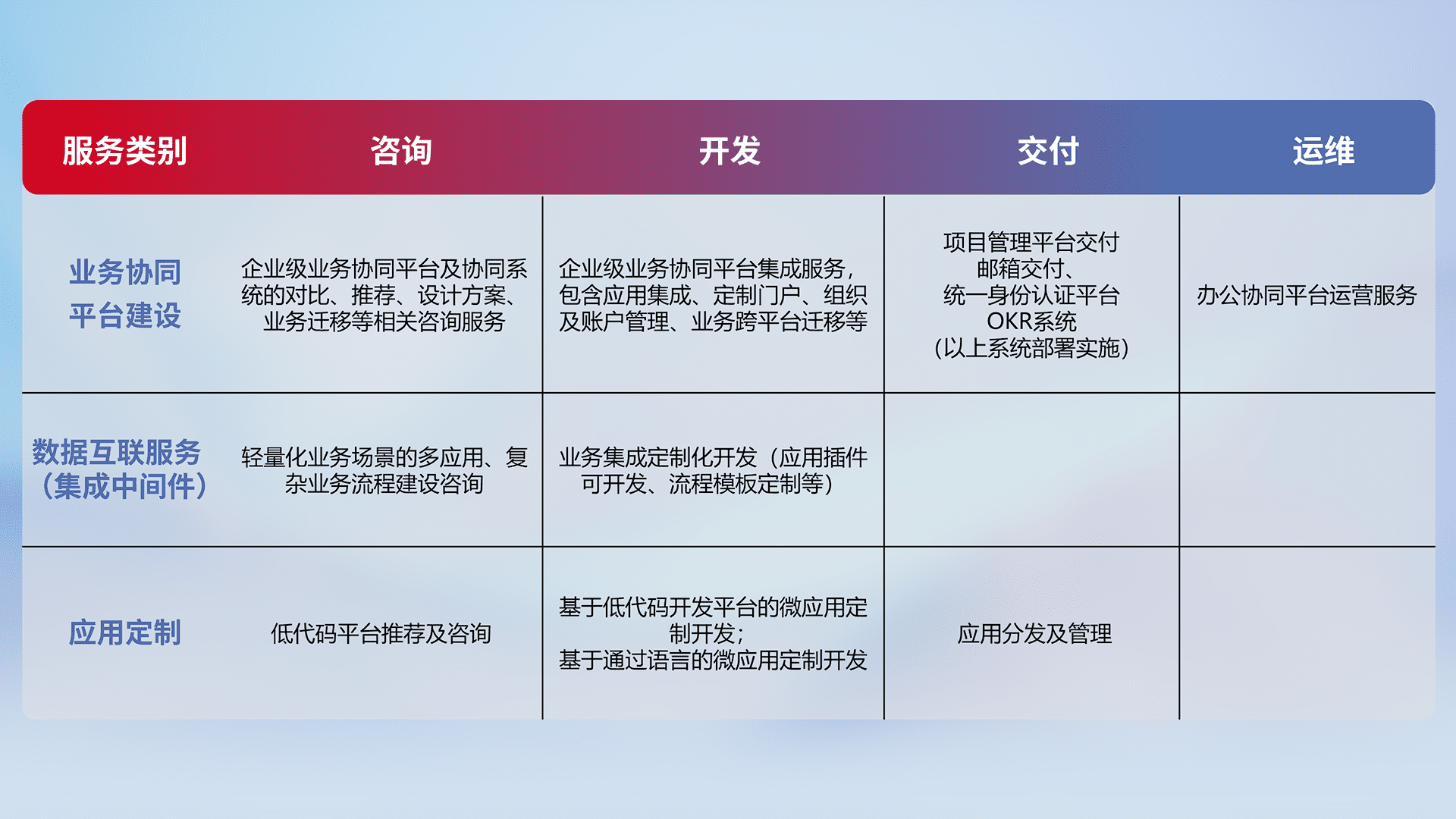 针对钉钉、、、企微、、、、IDaas等平台级产品提供产品的规划、、、、方案、、、、交付、、定制化开发等服务,,,实现如统一协同办公、、智能客户服务、、、、混合会议管理、、、、智能数据查询、、等业务场景,,实现数字化转型。。