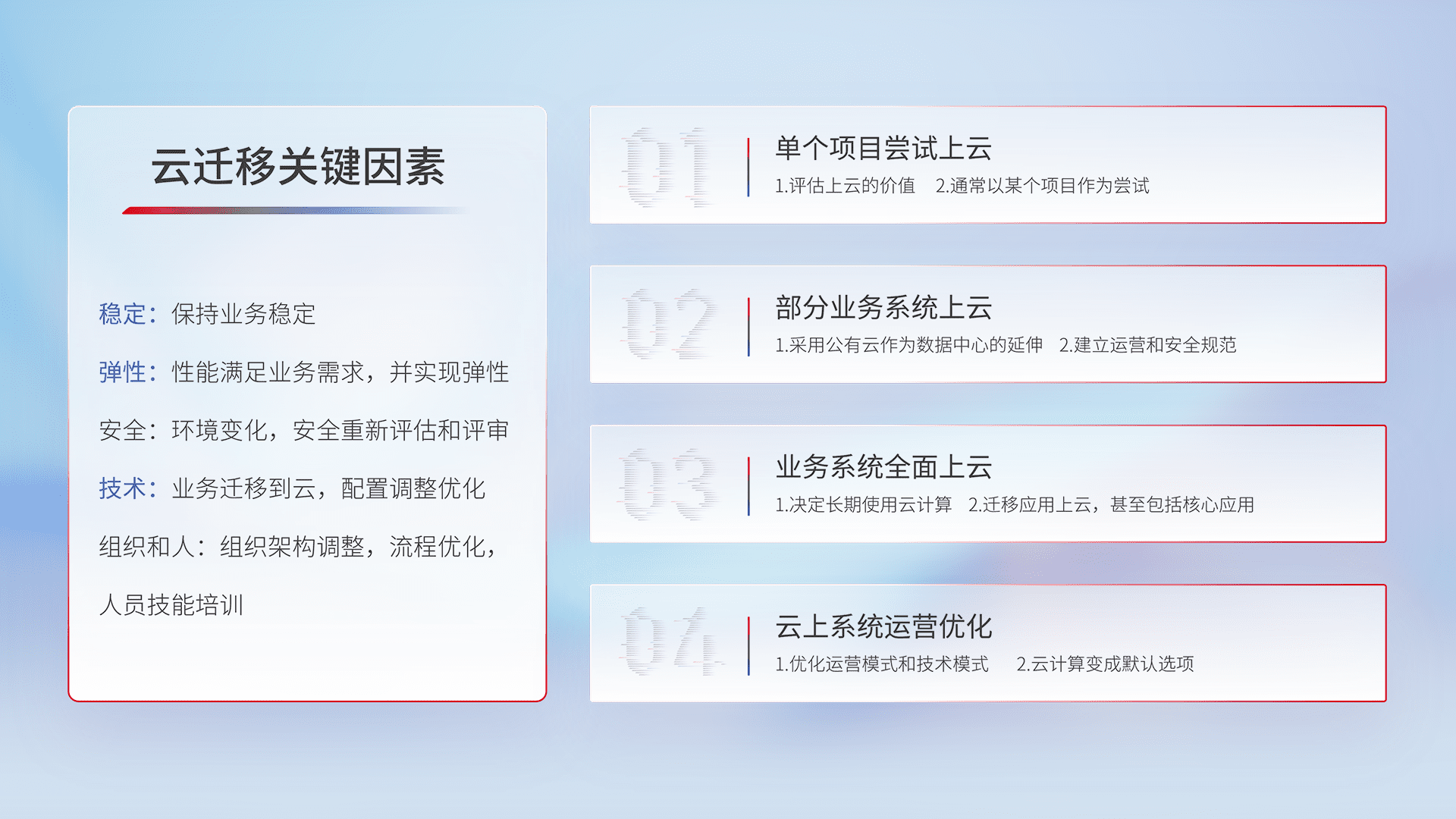 结合实际业务,,,从规划设计、、、云平台选型、、、、云原生改造、、数据迁移、、集成交付,,迁移全过程为客户识别最佳上云路径,,,做好风险识别管理,,,,设计网络架构、、、身份权限、、、安全审计合规、、操作审计、、、、日志审计、、、、监控告警策略、、、多站点容灾设计等,,,对云上基础设施进行整体规划,,,,提升IT治理水平,,以满足弹性、、高可用、、、、高性能的需求。。