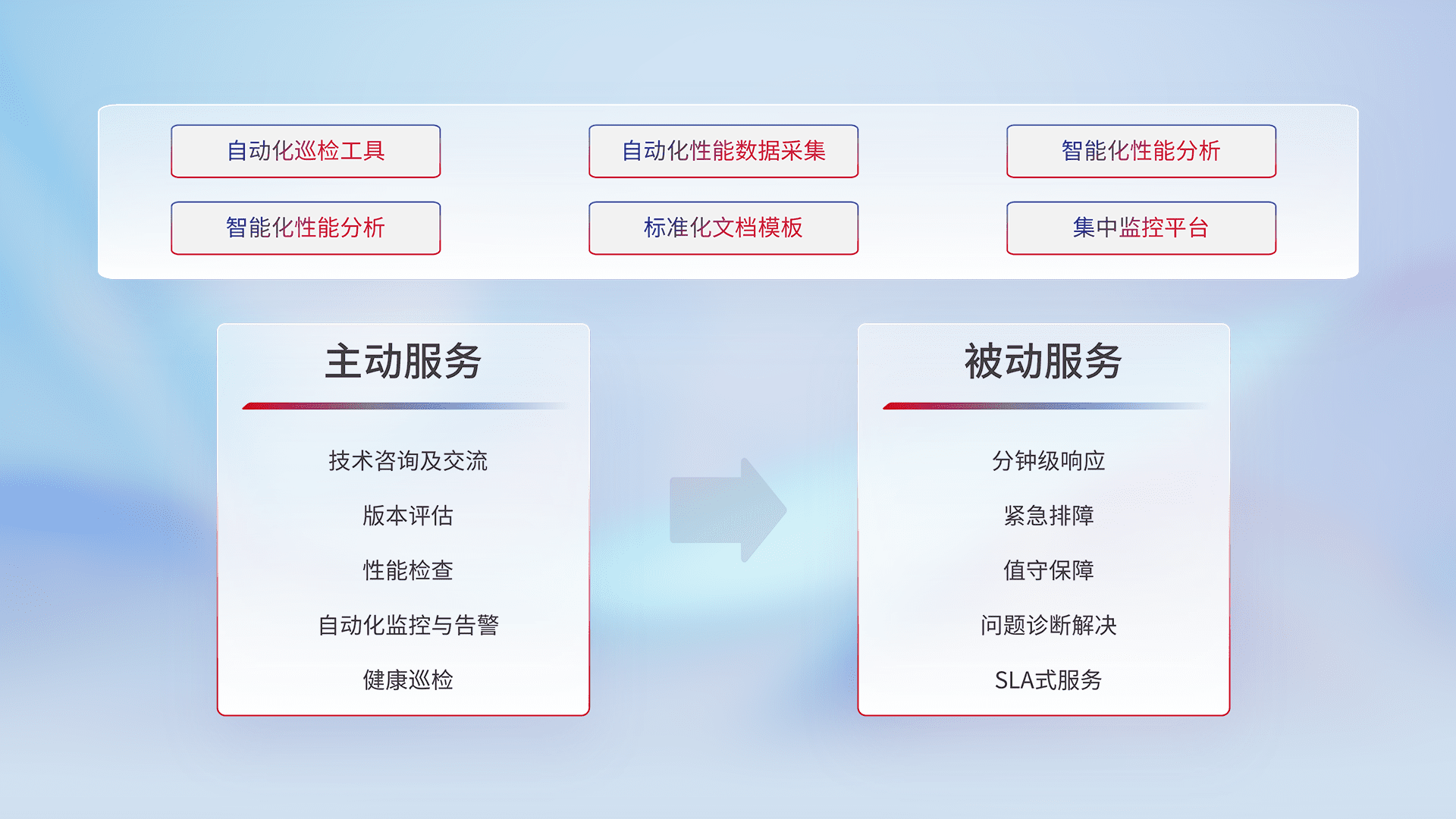 智能化工具和标准化文档,,,保障服务质量,,提供主动服务(包含技术咨询、、、、版本评估、、、性能检查、、、、自动化监控与告警、、、健康巡检)和被动服务包含(分钟级响应、、、、紧急排障、、、、值守保障、、、问题诊断解决、、SLA服务)。。。。